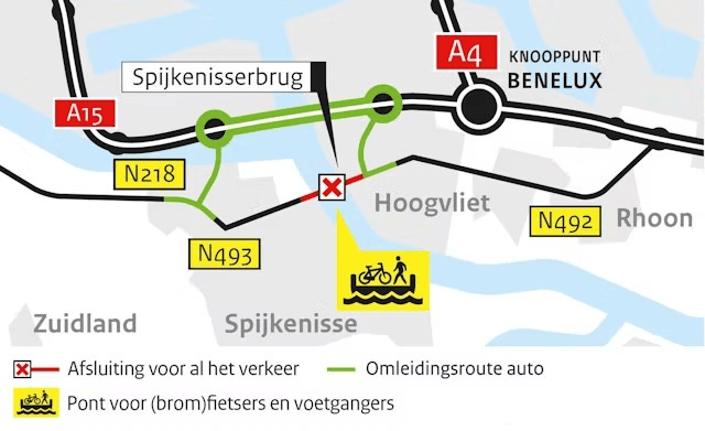 Het verkeer wordt omgeleid via de N218 (Hartelbrug) en A15 (Botlekbrug). Voor (brom)fietsers en voetgangers is er een pont beschikbaar. Hieronder vindt u een grafische weergave van de omleidingen.